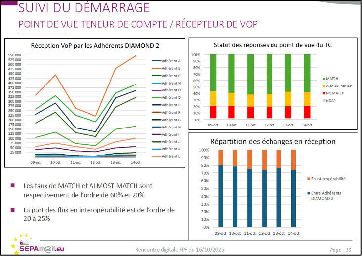 Sur la slide suivante, on voit que du point de vue du donneur d’ordre (émetteur de VoP), le taux (cumulé) de  « match » et « almost match » se situe entre 65% et 70%, et que le taux de NOAP est allé en décroissant. On voit aussi que deux adhérents (A et B) ont démarré « pied au plancher » et les autres ont raccordé leurs applications amonts plus progressivement.